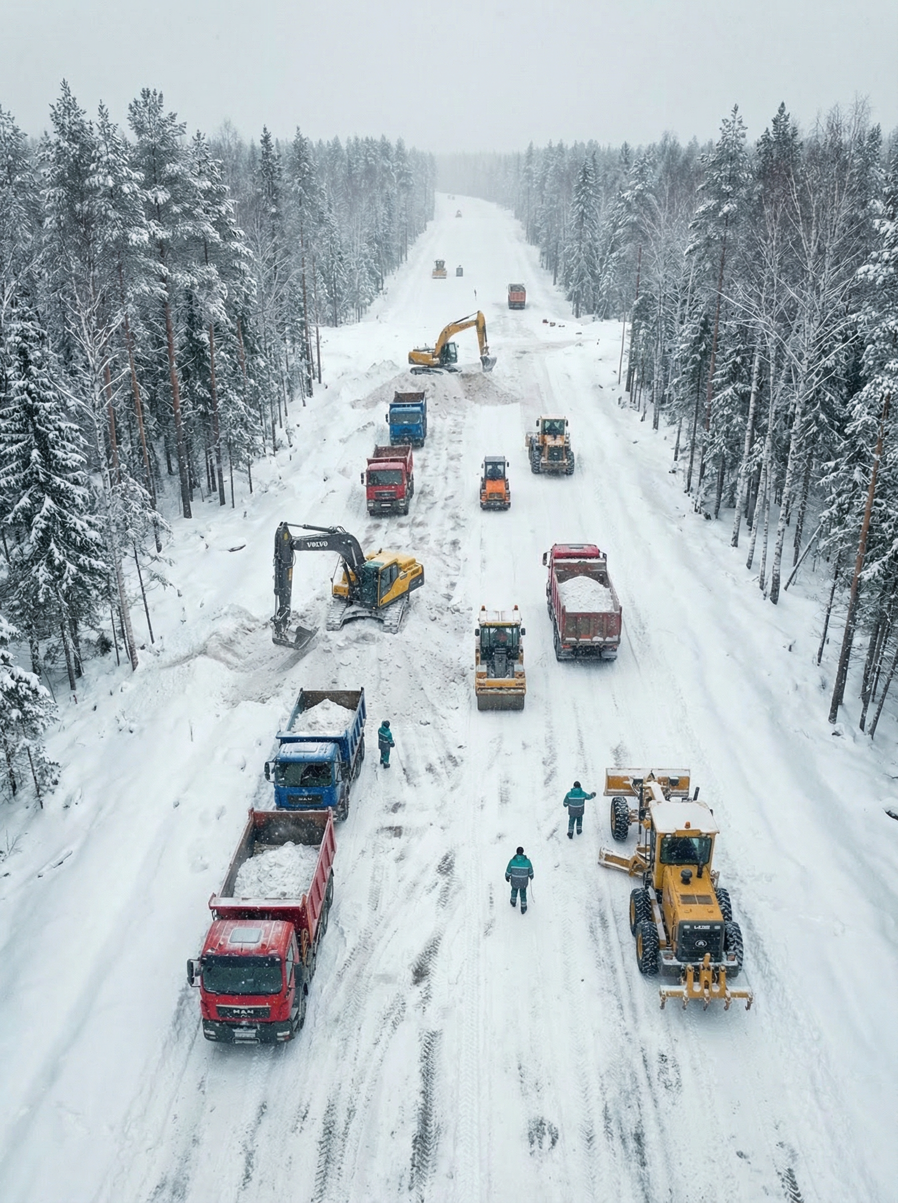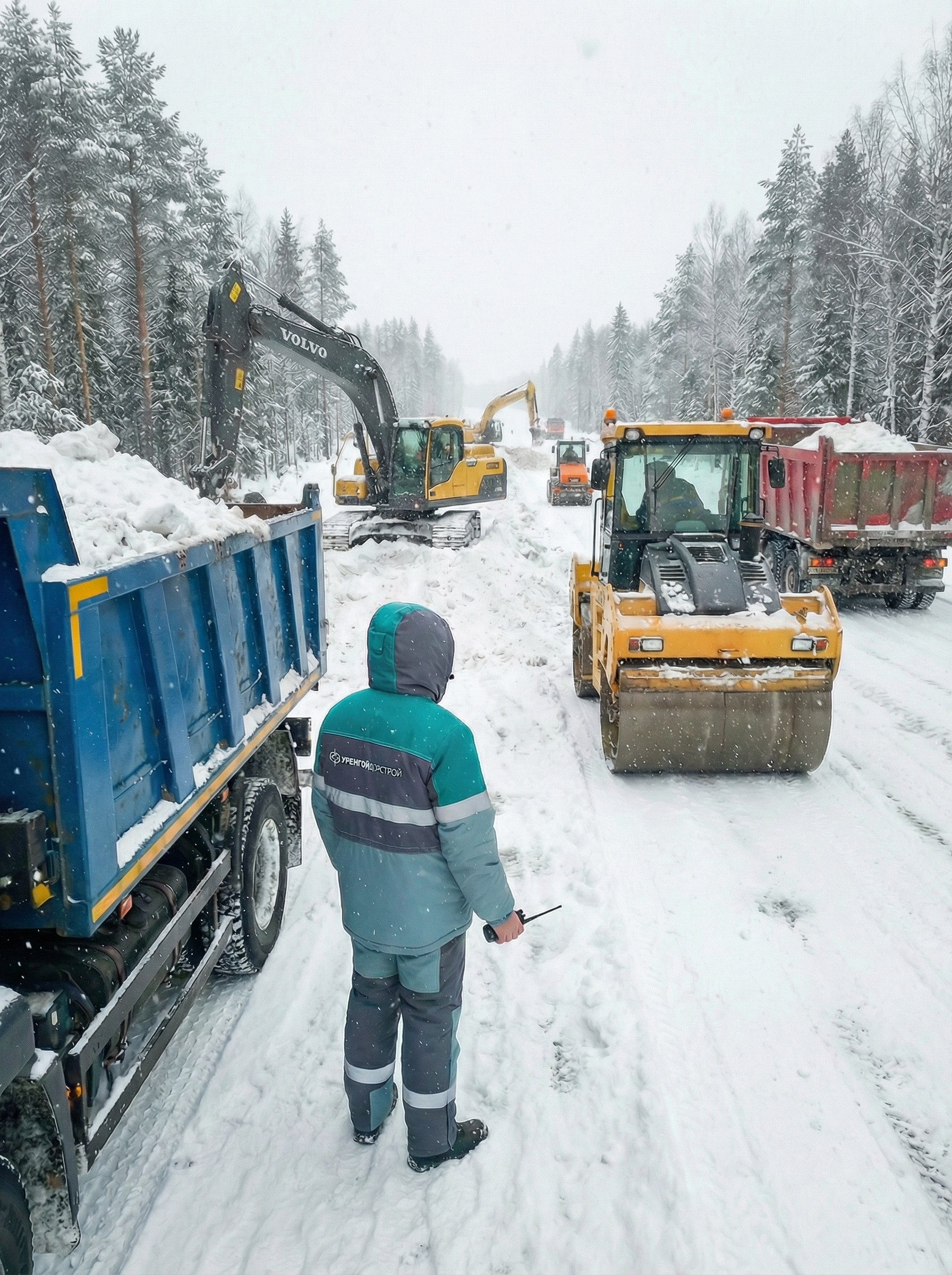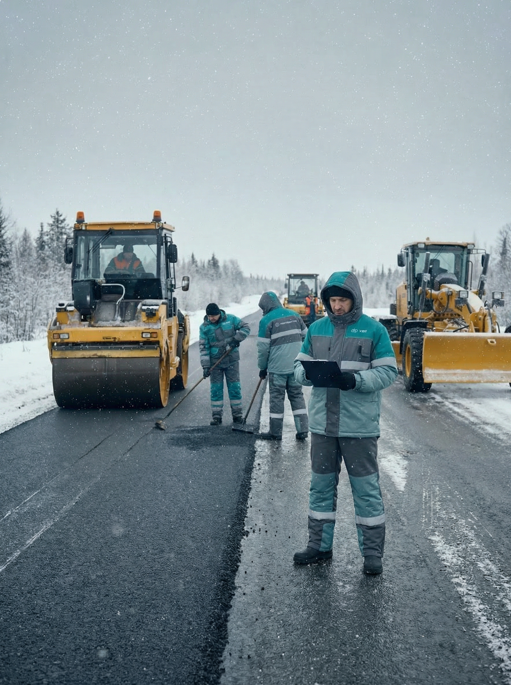 4. Непосредственная генерация рабочих процессов на гипотетической стройки дороги, где рабочие одеаты в отшитую брендированную одежду.